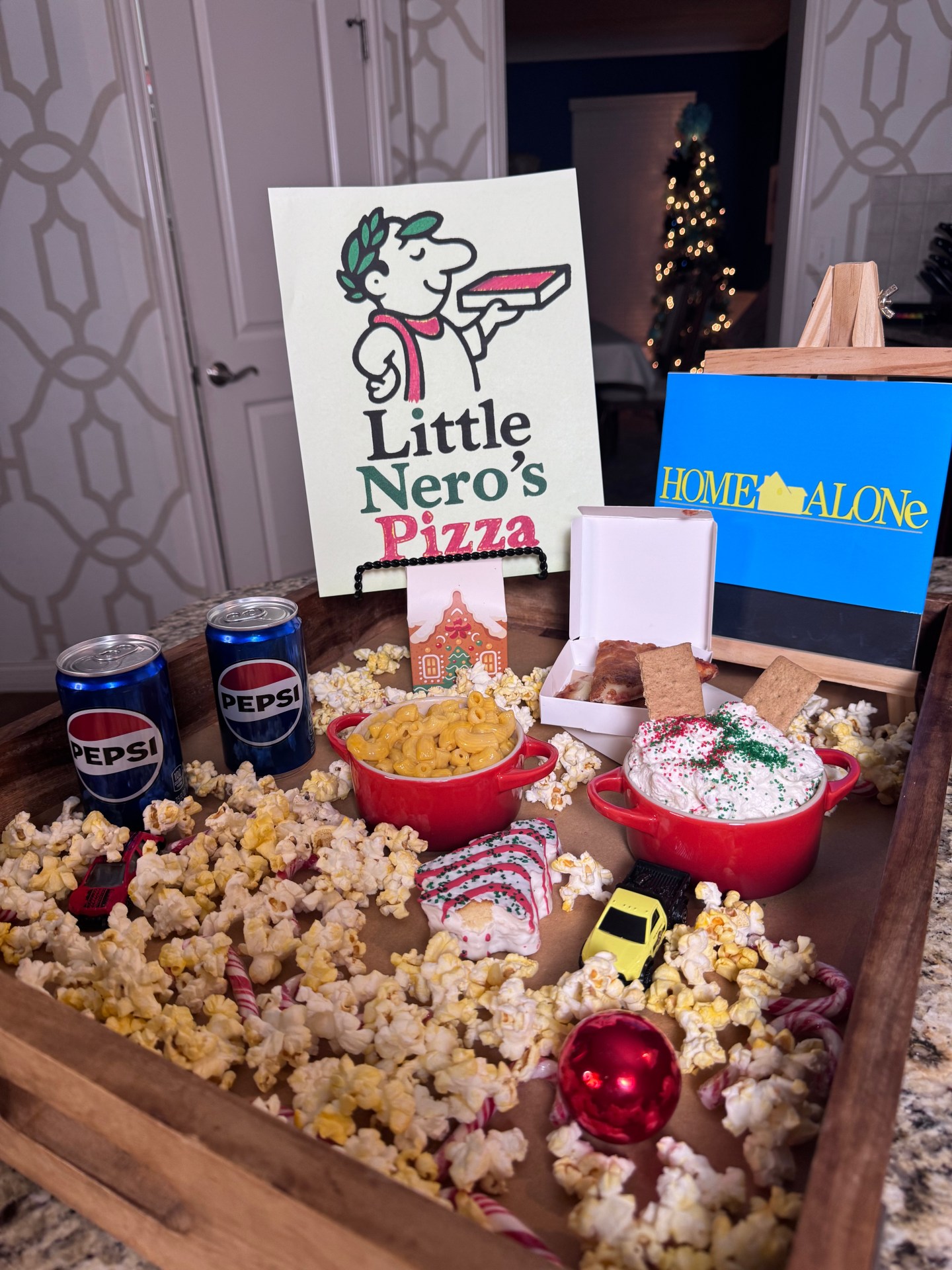 Create a festive Home Alone movie night with a themed snack board featuring pizza, savory treats, and sweet delights for all ages.