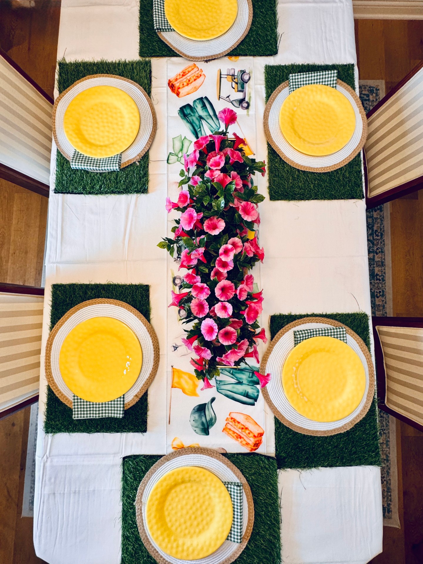 - Golf-Inspired Centerpieces and Table Scape: Use golf balls, tees, score cards and fresh flowers in green and yellow arrangements. I purchased these mini grass turfs off Amazon too. Bonus! They double for Easter decor.